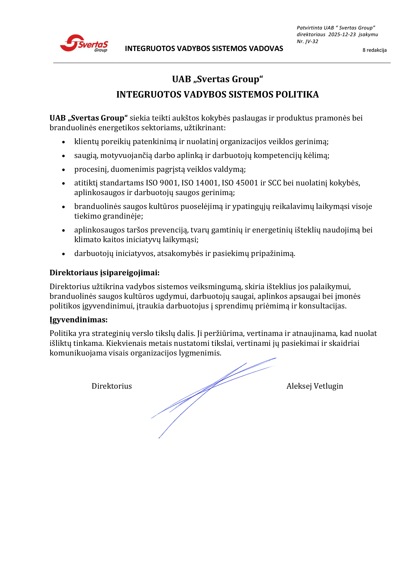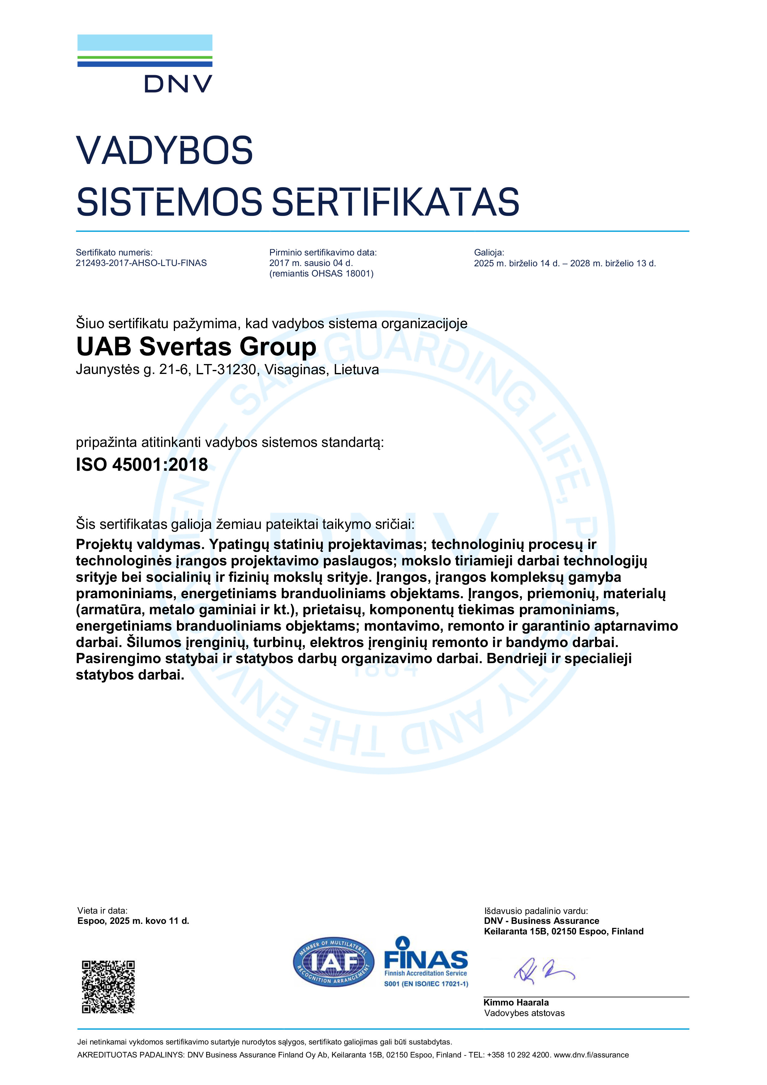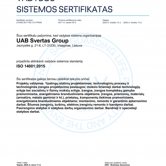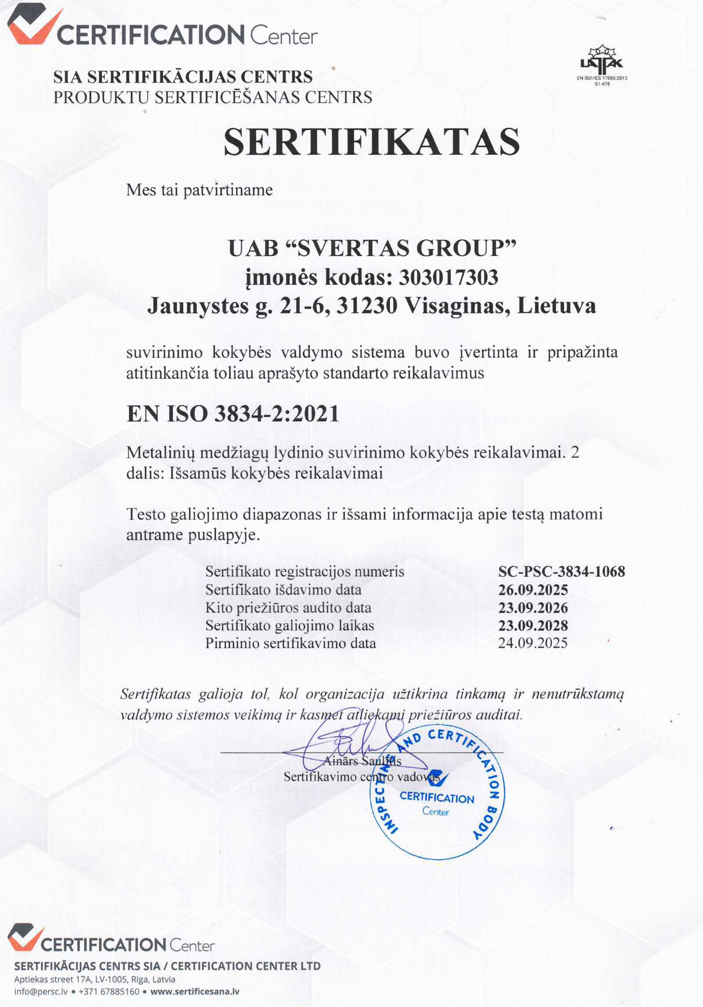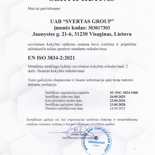 įmonė yra sertifikuota pagal ISO 3834-2 standartą, kuris patvirtina aukščiausius metalo suvirinimo kokybės reikalavimus. Šis sertifikatas užtikrina, kad visi darbai atliekami pagal tarptautinius standartus, naudojant patikrintas technologijas ir kvalifikuotų specialistų žinias.