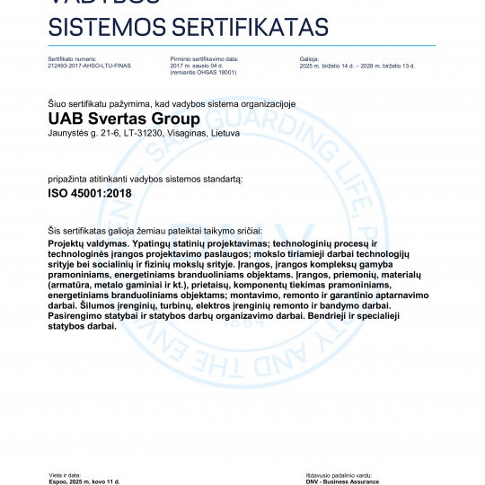 2019 metais UAB „Svertas Group” gavo TÜV SÜD Management Service GmbH sertifikatą, patvirtinantį darbo apsaugos ir sveikatos, bei ir aplinkosaugos valdymo sistemos atitikimą tarptautiniam standartui SCC.